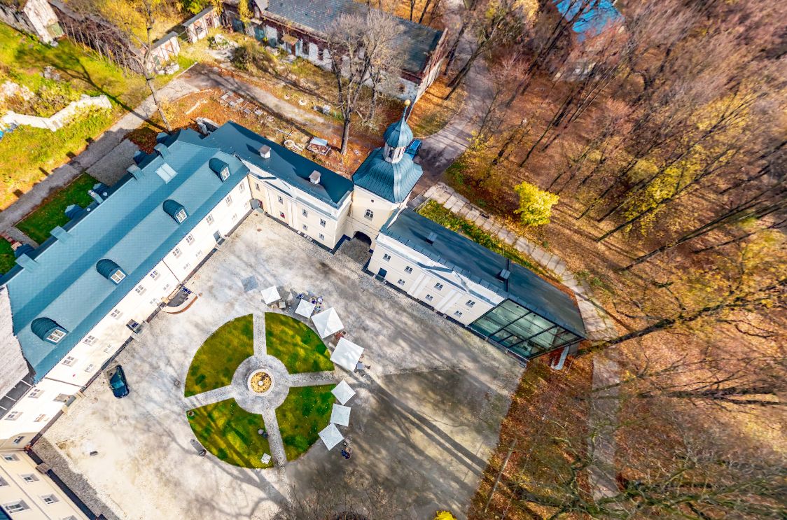 Spacer wokół pałacu pozwala dostrzec, że obiekt był projektowany jako element większego organizmu – dziedzińce, przejścia, układ skrzydeł i relacje z parkową zielenią tworzą logiczną całość, w której funkcja reprezentacyjna łączyła się z gospodarczą. Z jednej strony mamy część bardziej „pałacową”, skierowaną ku parkowi i gościom, z drugiej – strefy zaplecza, powiązane z dawnym folwarkiem, zabudowaniami gospodarczymi i codziennym funkcjonowaniem rezydencji. Dzięki temu obiekt nie jawi się jako izolowany „pałacyk w parku”, ale jako serce dawnego majątku, od którego promieniowała cała lokalna struktura społeczno‑ekonomiczna.